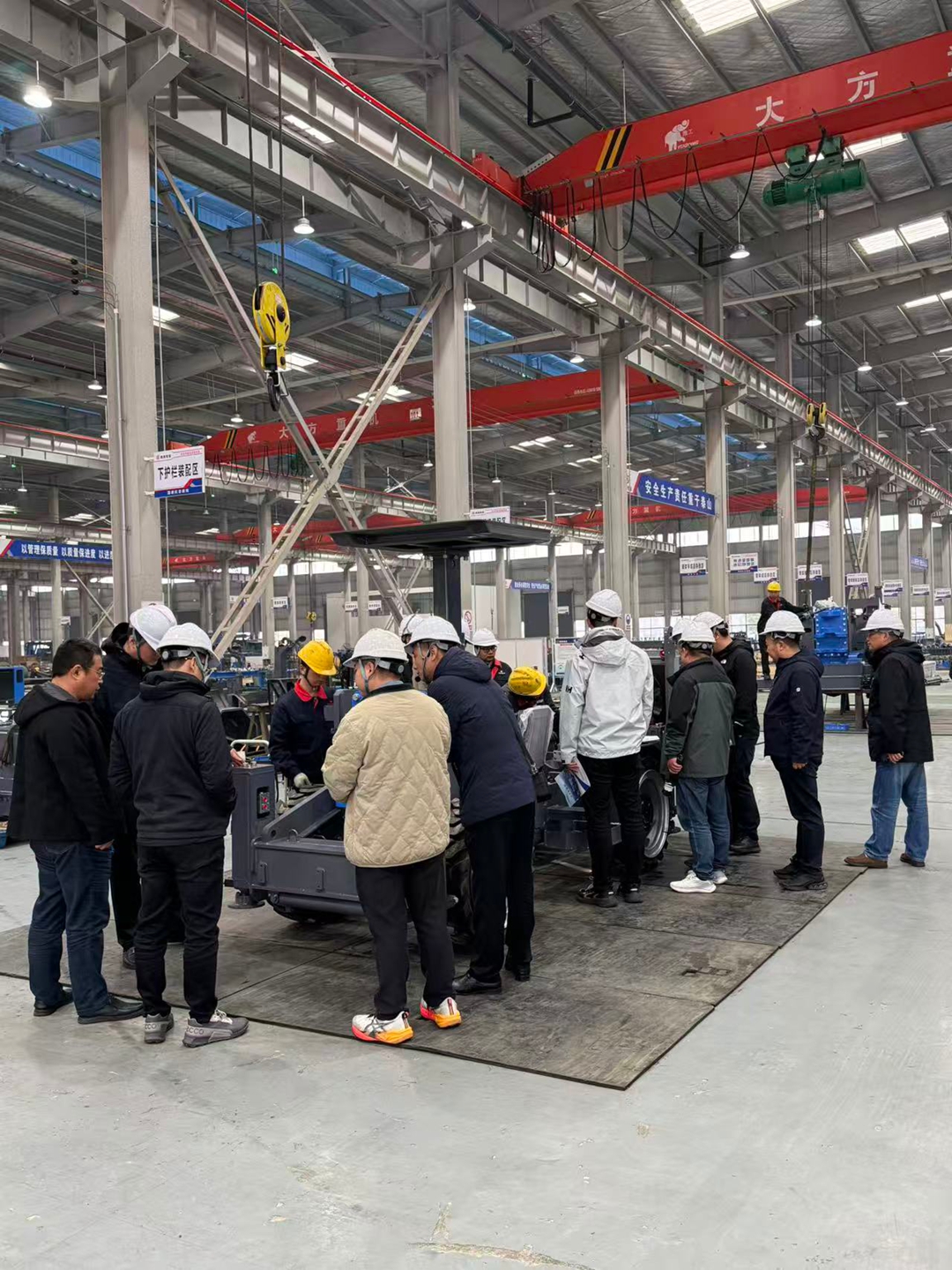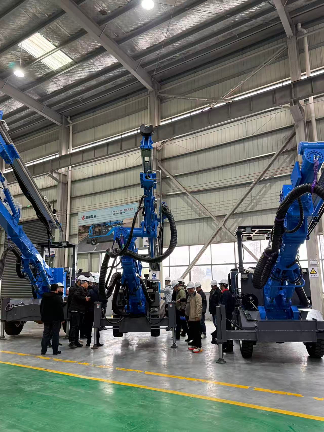 随后,考察组一行深入生产车间和设备展区。从凿岩台车的零部件加工到湿喷机的成品调试,从生产工艺的细节把控到设备在矿山场景的实际应用,考察组看得格外认真,时不时停下脚步和我们的技术师傅交流探讨。师傅们也毫无保留,把设备研发的思路、施工中的实操经验一一分享,现场氛围格外热烈。