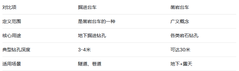 简单来说:掘进台车 ⊂ 凿岩台车,两者是包含关系,而非对立关系。