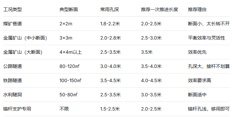 掘进台车孔深与推进长度匹配:推进长度比孔深长0.2-0.5米最合适。太短要接杆,太长浪费。