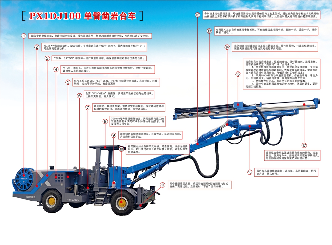 凿岩机具有凿岩硬度高、钻孔速度快、低钎具消耗、故障率低。 1、凿岩机自带缓冲减震系统,高效吸收反冲能量,大大消减凿岩冲击对凿岩机与油路影响,大幅度隆低故障率,提高凿岩机与钻具易损件便用寿命,降低易损件的使用成本; 2、采用18KW有效功率液压凿岩机,作业效率高、冲击力大、回转扭矩大,钻孔速度快,提高整车的施工效率; 3、易损件性价比高,为客户节约施工耗材成本; 4、回转中心至机顶距离仅为94.6mm,外插角更小,更好的超欠挖控制。