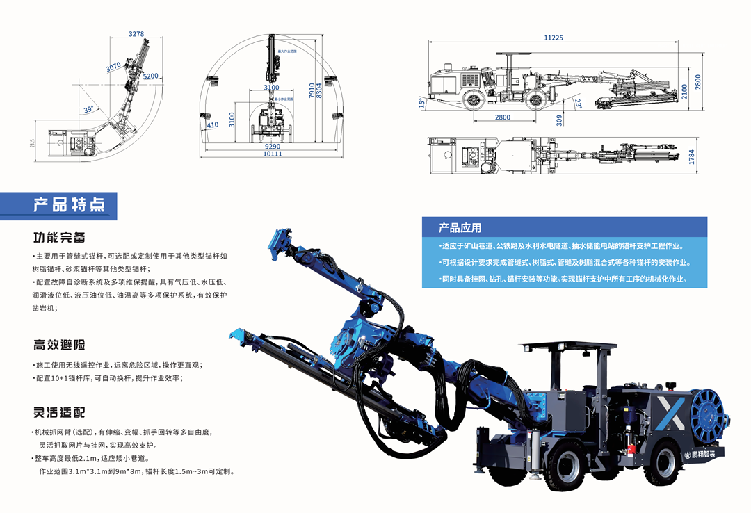 ·适应于矿山巷道、公铁路及水利水电隧道、抽水储能电站的锚杆支护工程作业。 ·可根据设计要求完成管缝式、树脂式、管缝及树脂混合式等各种锚杆的安装作业。 ·同时具备挂网、钻孔、锚杆安装等功能。实现锚杆支护中所有工序的机械化作业