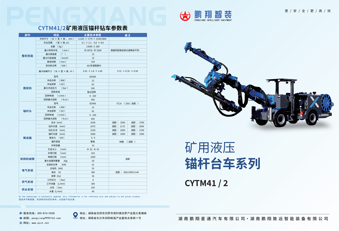 ·主要用于管缝式锚杆,可选配或定制使用于其他类型锚杆如 树脂锚杆、砂浆锚杆等其他类型锚杆; ·配置故障自诊断系统及多项维保提醒,具有气压低、水压低、 润 滑 液 位 低、液 压 油 位 低、油 温 高 等 多 项 保 护 系 统,有 效 保 护 凿岩机;